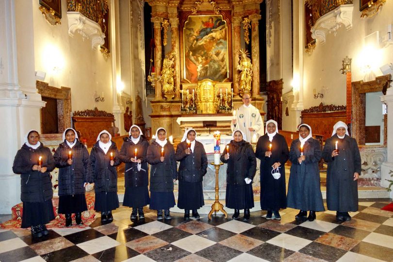 Bei der Gottesdienst-Feier in der Pfarrkirche „Maria Himmelfahrt“ dankte Pfarrer Klaus Hofstetter den Schwestern für ihren Dienst am Menschen und für ihr Zeugnis zu Gott. „Möget Ihr spüren, dass Jesus immer ganz nah ist, denn Jesus ist uns aller  Bruder, er ist lichtvoll, auch wenn es manchmal scheint, dass er weit weg ist“. Gemeinschaftlich sprachen die Schwestern die Gelübde-Erneuerung, erinnerten, dass sie in ihrer indischen Heimat das Versprechen gaben, ihr Leben dem lieben Gott zu weihen sowie Armut, Keuschheit und Gehorsam weiterhin gelten zu lassen. Nur Schwester Anna, die notwendigen Dienst hatte, konnte beim Gottesdienst nicht selbst zugegen sein. „Im Vorjahr – so Pfarrer Hofstetter – trafen wir uns nach der Gelübde-Erneuerung zu einem indischen Essen im Altenheim – das war ein schönes Erlebnis, das es heuer leider nicht gibt“.