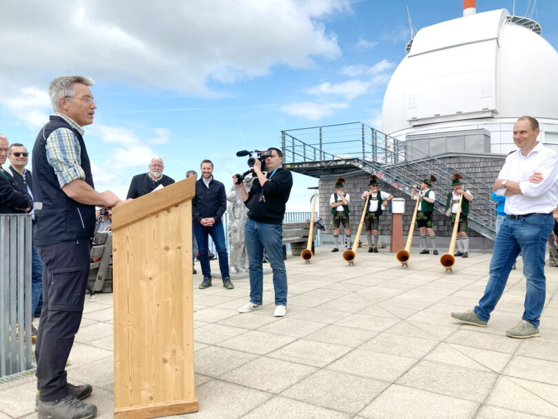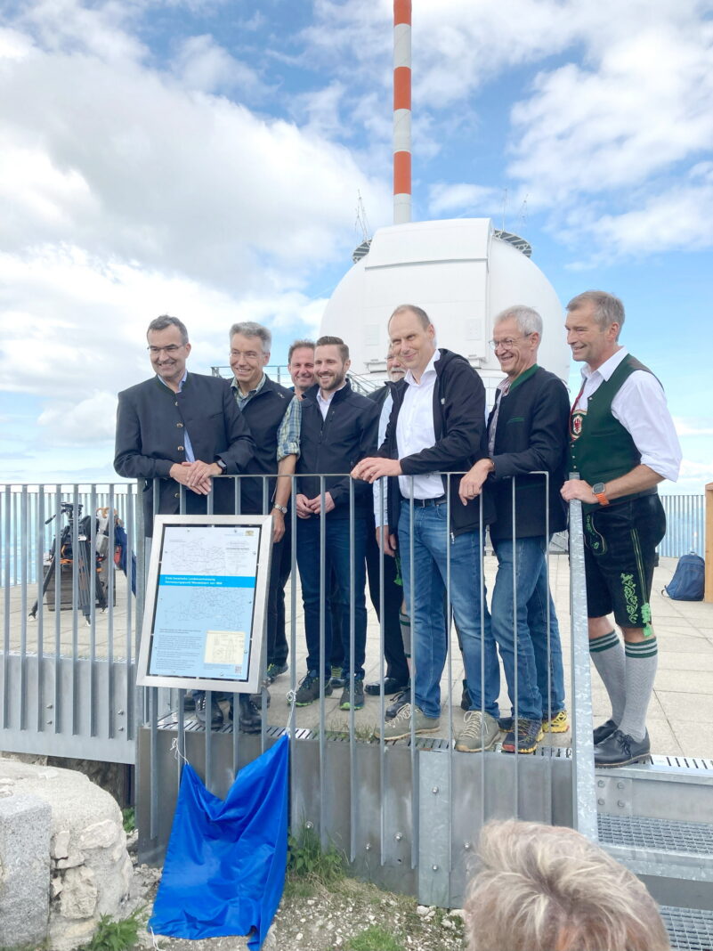 Auf dem Gipfel des Wendelsteins befindet sich einer der letzten markierten Vermessungspunkte aus der Zeit der ersten bayerischen Landesvermessung. Ab sofort macht eine neue Infotafel auf dessen Bedeutung aufmerksam. Der Präsident des Landesamts für Digitalisierung, Breitband und Vermessung (LDBV), Daniel Kleffel, und der Geschäftsführer der Wendelsteinbahn GmbH, Florian Vogt, präsentierten die Infotafel im Rahmen eines gemeinsamen Pressetermins am 6. Juni 2025.