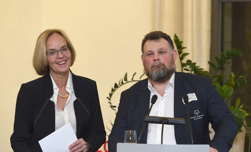 Auf dem Foto sind Christiane Krajewski (links), Vorsitzende des Weltspielekomitees und Präsidentin von Special Olympics Deutschland und Mark Solomeyer (rechts), Bundesathletensprecher und Mitglied des Weltspielekomitees zu sehen. (Quelle: Pressefoto Berlin / Juri Reetz).