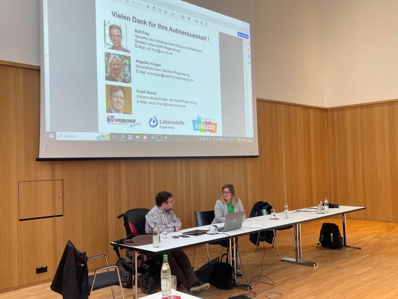 Foto & Text: Landkreis Landshut -Frank Reinel, Inklusionsbeauftragter der Stadt Regensburg berichtet den Mitgliedern des Runden Tisches Inklusion im Arbeitsleben auf Einladung von Linda Pilz, Behindertenbeauftragte Landkreis Landshut (rechts) über die 1. Regensburger Jobmesse, die im vergangenen Jahr stattfand.
