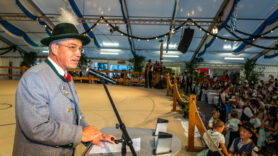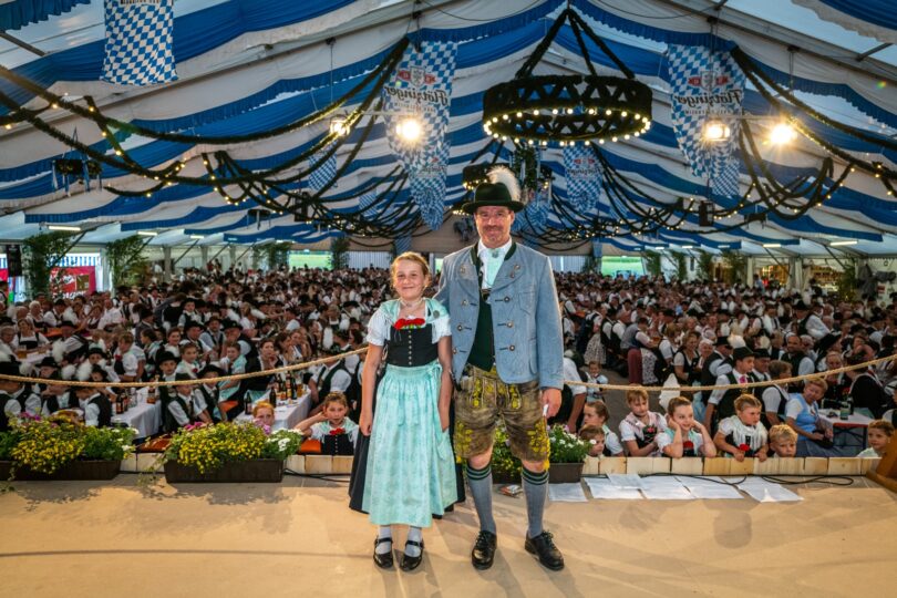 Willkommensgrüße und zugleich Anerkennung für die gezeigten Gemeinschaftsleistungen bei Vorbereitungen, Zeltaufbau und Programmgestaltung gab es von Pfaffenhofens Vorstand Anderl Rausch (auch namens von Festleiter Michi Schlaipfer), von Bürgermeister und Schirmherrn Stefan Adam (auch namens von Mit-Schirmherrn und Oberbürgermeister Andreas März von Rosenheim), von Zweiten Gauvorstand vom Bayerischen Inngau-Trachtenverband Max Kronberger (auch namens von Erstem Gauvorstand Pankraz Perfler und der gesamten Gauvorstandschaft) und von Landrat Otto Lederer, der in seinem Grußwort nicht verhehlte, dass das Gesellschaftsleben im Landkreis Rosenheim ohne die kulturellen Beiträge der Musik- und Trachtengruppen sowie der Vereine und Gauverbände um Vieles ärmer wäre. Besonders herzliche Willkommensgrüße galten den Vertretern des Bayerischen Trachtenverbandes, des Paten-Gaues Chiemgau-Alpenverband, des Gauverbandes I, sowie den vielen kommunalpolitischen Vertretern aus den Landkreisen Rosenheim, Miesbach und Ebersberg. Der frohmachende Heimatabend klang lange nach, besonders in der einladend hergerichteten Bar, in dieser spielten noch die „Preana Buam“ auf. Bereits am Vorabend gratulierte der Patenverein Alt-Rosenheim mit Vorstand Richard Teichner mit einem eßbaren Hosenträger in Form einer Torte und der Nachbarsverein Hochstätt, vorjähriger Ausrichter des Inngau-Trachtenfestes überreichte durch Vorständin Kathi Schildhauer einen Obstkorb zum „kulinarischen Ausgleich der sonst recht wurstlastigen Geschenkkörbe“.