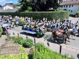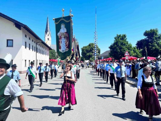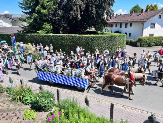 Zu den vielen Trachtlerinnen und Trachtlern, Fahnenabordnungen und Musikanten meldeten sich noch 27 Kutschen, Motiv- und Trachtlerwägen sowie Vorreiter für den nachmittäglichen Festzug an. Vor dem vormittäglichen Gottesdienst hieß Gauvorstand Pankraz Perfler die Aktiven und Besucher willkommen und dankte für das schöne Miteinander. Pfarrer Herbert Aneder vom Pfarrverband Pfaffenhofen-Hochstätt und Pfarrer Dr. Richard Graupner aus Großkarolinenfeld gingen in ihren ökumenischen Gebeten und Reden auf das Verbindende und Gemeinsame von Glaubens- und Brauchtumspflege ein – wie schon ein Jahr zuvor beim Trachtenverein Hochstätt und gleichem Pfarrverband. Die musikalische Gestaltung übernahmen die Festmusikkapelle Hochstätt sowie die örtlichen Chöre unter der Leitung von Leni Feichtner.
