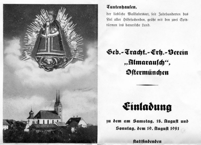 Der 1903 gegründete Bayerische Inngau-Trachtenverband hat heuer ein besonderes Jubiläumsjahr: er kann –sofern es die Corona-Krisen-Entwicklung zulässt-  am Sonntag, 12. Juli in Ostermünchen sein 100. Gaufest feiern. Zugleich ist geplant, am Sonntag, 16. August zum 70. Male die Gautrachtenwallfahrt der Inngauer Trachtler durchzuführen. Die erste Gautrachtenwallfahrt war anlässlich des 30jährigen Gründungsfestes vom Gebirgs-Trachten-Erhaltungs-Verein „Almarausch“ Ostermünchen zum Wallfahrtsort Tuntenhausen am Sonntag, 19. August 1951. Inzwischen ist es Tradition, dass die Inngau-Wallfahrt von Brannenburg aus beginnend zur Wallfahrtskirche nach Schwarzlack führt. Im Zuge der Vorbereitungen der Ostermünchner Trachtler auf ihre heurigen Jubiläen ist aufgefallen, dass von der ersten Wallfahrt im Jahr 1951 keine Fotos vorhanden sind. Deswegen meldet sich der Festverein und macht einen Aufruf. „Vielleicht haben wir das Glück, dass sich Jemand an diese Wallfahrt erinnert oder sogar weiß, wer damals eventuell fotografiert hat. Das wäre für unseren Verein und für unsere Chronik eine schöne Sache“ – so Dorothea Niedermaier vom Trachtenverein Ostermünchen (Tel. 08067-672, email d.niedermaier@gmx.de). Leute, die zur Wallfahrt 1951 nach Tuntenhausen etwas wissen, mögen sich bitte direkt bei Frau Niedermaier melden.