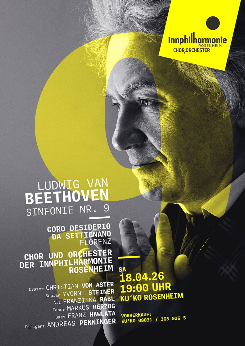 In ihrem diesjährigen Frühjahrskonzert am 18. April lässt die Innphilharmonie Rosenheim in Zusammenarbeit mit dem Gastchor “Coro Desiderio da Settignano” aus Florenz unter der künstlerischen Leitung von Andreas Penninger Ludwig v. Beethovens Symphonie No. 9 op. 125 erklingen.