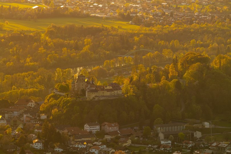 In einem ganz besonderen Abendlicht präsentiert sich in diesen Tagen das bayerische Inntal – wie diese aktuellen Aufnahmen zeigen. Einmal präsentiert sich die Gemeinde Neubeuern mit dem ortsprägenden Schloss und im weiteren Bild weitet sich der Blick über Neubeuern bis zur Gemeinde Raubling.