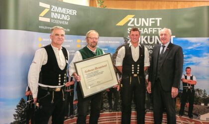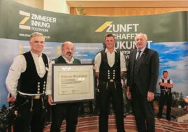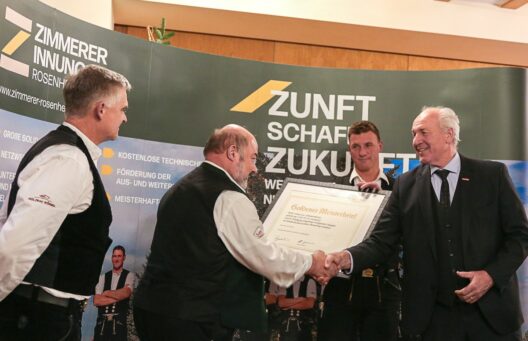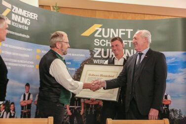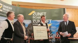 Der Kammer-Präsident Franz Xaver Peteranderl überreichte im Anschluss gemäß den Richtlinien der Handwerkskammer den Goldenen Meisterbrief für HandwerksmeisterInnen an Sebastian Bleier (Zimmerei Bleier & Weyerer, Kiefersfelden), Lorenz Loy (Zimmerei Loy, Söchtenau) und Georg Rottmüller (Zimmerei Rottmüller, Thalacker), nicht ohne zu jedem eine kleine Laudatio zu halten und die Arbeit der Innung entsprechend zu würdigen.