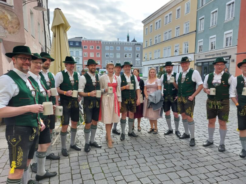 Rosenheim – „. . . das ganze Wochenende durchgeplattelt“ haben die Innviertler Trachtler. Losgegangen ist es bei der Rosenheimer Wirtshausroas. Zur offiziellen Eröffnung war gleich ein Marschplattlerpotpourri fällig. Im Anschluss posierten die Plattler mit der Bayerischen Bierkönigin Sarah Jäger (Foto 1). Dann machten sich die Innviertler selbst auf ihre Wirtshausroas. An insgesamt acht Veranstaltungsorten zeigten sie weiterhin ihr plattlerisches Können.