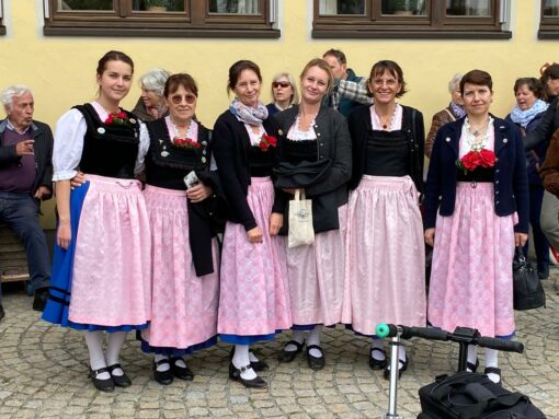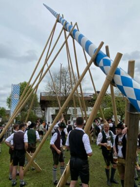 Fleißig Werbung wurde für den Festabend „120 Jahre Innviertler Rosenheim“, der am 1. Juli in der Auerbräu Festhalle gefeiert wird, gemacht. Für den, der das platteln lernen will, gibt es ab dem 5. Juli wieder einen Plattlerkurs. Was die Männer können, können natürlich auch die Trachtlerinnen. Zum Maibaumaufstellen am darauf folgenden Tag, stellten sie sich für den Fotografen in Pose (Foto 2). Mit Unterstützung des Trachtenvereins Alt Rosenheim und der Happinger Ortsvereine wurde mit viel Muskelkraft im Wirtsgarten des Gasthauses Happinger Hof der Maibaum aufgestellt (Foto 3). Unter den Klängen der Wasner Blasmusik wurde noch fleißig getanzt und geplattelt.