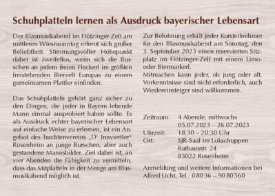Ab Mittwoch 5. Juli, 18:30 Uhr laden die „Innviertler“ wieder zum beliebten Plattlerkurs. An vier Übungsabenden wird der Marschplattler „Ambosspolka“ einstudiert. Ziel ist es am 3. September zum Blasmusikabend der „Dreder Musi“ im Flötzinger Zelt auf dem Rosenheimer Herbstfest mitplatteln zu können.