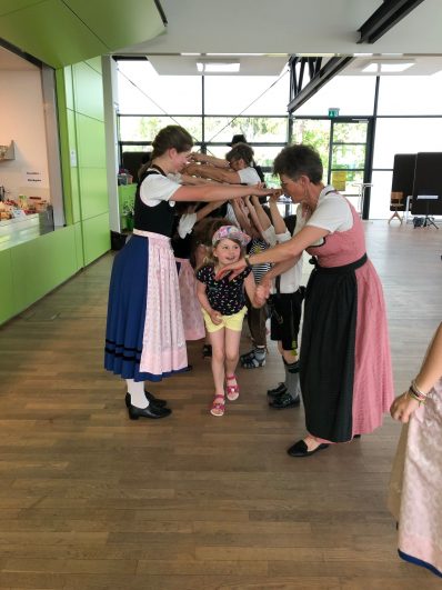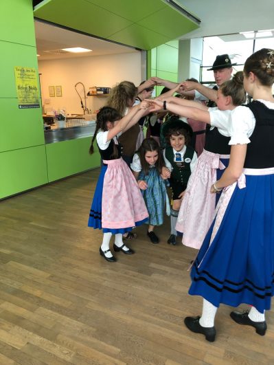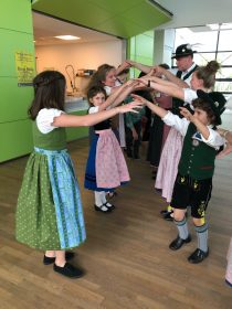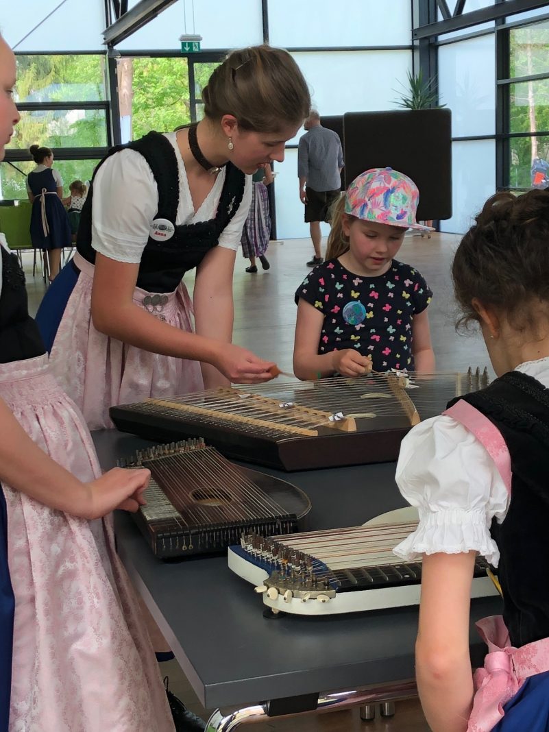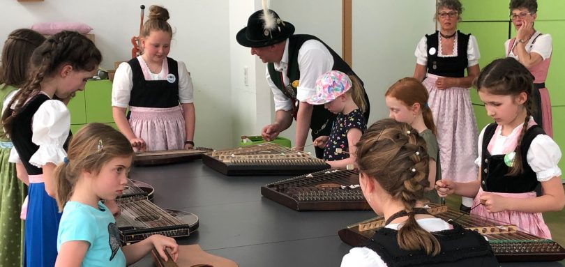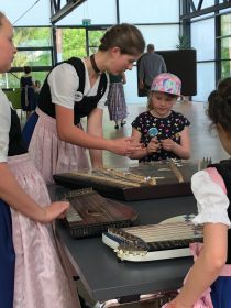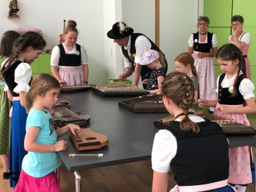 Auch heuer kamen rund 25 Teilnehmer zu den „Innviertlern“, um die vielfältigen Aktivitäten der vereinseigenen Kinder- und Jugendgruppe einmal unverbindlich kennenzulernen. Je nach Interesse konnte man sich an einfachen Tänzen beteiligen oder bei Singspielen mitwirken. Das engagierte Team um Jugendleiterin Steffi Schubert hatte sich allerhand einfallen lassen, den Kindern ein buntes und kurzweiliges Programm zu bieten. Während die Buben das Schuhplatteln probieren durften, ließen sich die Mädchen passend zum Dirndlgwand schön frisieren. Sehr beliebt war bei den Teilnehmern auch das Angebot, mal ein paar Schläge am Hackbrett auszuprobieren oder an der Zither zu zupfen. Und schon nach einer kurzen Anleitung von Anna und Leonhard Wimmer konnte die erste Musikaufführung des „Kinder-Orchesters“ hören lassen.