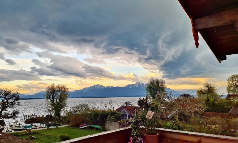 Das gemischte Wetter nach dem Motto “Es macht was es will” setzt sich auch über den April hinaus fort und wird zum Mai-Anfang fortgesetzt – davon zeugt diese aktuelle Aufnahme, die auf der Fraueninsel entstand und einen Blick über den See und über die Bergwelt in das aufgewühlte Gewölk zeigt.