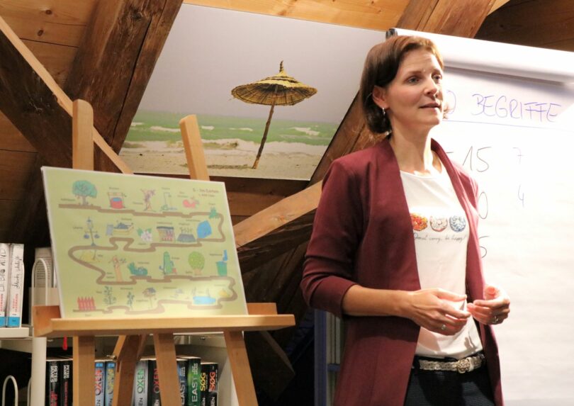 Foto: Kirsten Wunderle, Azubi- und Lerncoach, hat zu der interaktiven Lesung eine ALMUT-Liste in die Bücherei Prien mitgebracht. Oben links beginnt der „Alphabet-Erinnerungs-Spaziergang“ am Apfelbaum mit dem nördlichsten Land