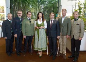: AGDW-Präsident zu Guttenberg, Josef Ziegler, Präsident des Bayerischen Waldbesitzerverbandes, und dessen Geschäftsführer Hans Ludwig Körner beim Rundgang mit Landwirtschaftsministerin Michaela Kaniber