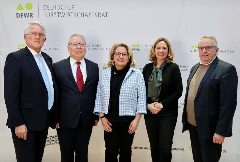 Bericht und Foto: DFWR: Parlamentarischer Abend des Deutschen Forstwirtschaftsrats (DFWR) in Berlin (v.l.n.r.): Georg Schirmbeck, DFWR-Präsident, Mandakhbileg Birvaa, Botschafter der Mongolei, Svenja Schulze, Bundesministerin für wirtschaftliche Zusammenarbeit und Entwicklung, Elisabeth Aßmann, Staatssekretärin im Ministerium für Klimaschutz, Landwirtschaft, ländliche Räume und Umwelt Mecklenburg-Vorpommern, Till Backhaus, Minister für Klimaschutz, Landwirtschaft, ländliche Räume und Umwelt Mecklenburg-Vorpommern.