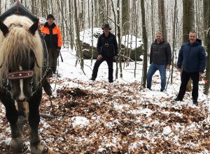 Wie Pferd Moritz Buchenstämme in die Versuchsflächen zieht, erklärte Nationalparkmitarbeiter Stephan Melch (v.l.) dem Nationalparkleiter Dr. Franz Leibl, Bürgermeister Michael Herzog (v.r.) und seinem Stellvertreter Manfred Schröder. (Foto: Elke Ohland/Nationalpark Bayerischer Wald)