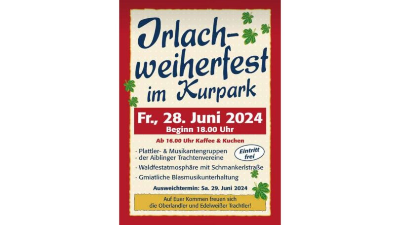 Am kommenden Freitag, den 28. Juni 2024, findet im Kurpark Bad Aibling das Irlachweiherfest der Aiblinger Trachtenvereine statt. Die Besucher erwartet Plattler- und Musikantengruppen, Waldfestatmosphäre mit einer Schmankerlstraße sowie eine gemütliche Blasmusikunterhaltung.