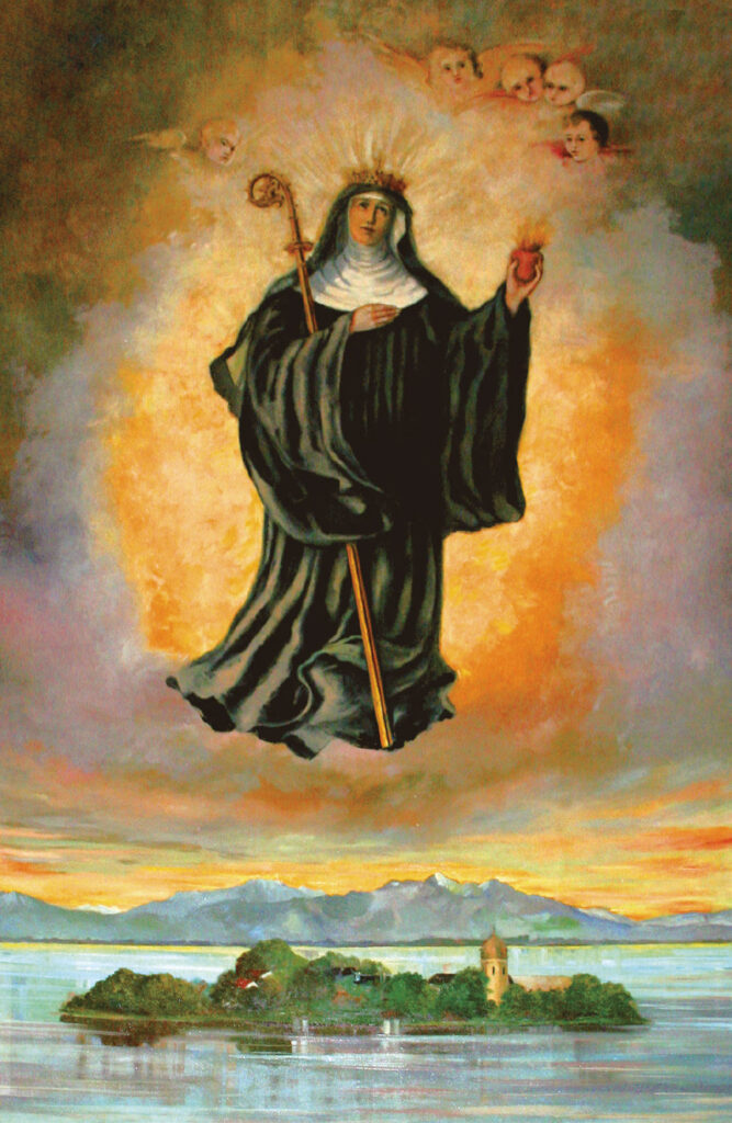 Darstellung der Seligen Irmengard über der Fraueninsel im Chiemsee. Als Tochter Ludwigs des Deutschen wurde Irmengard Äbtissin des Klosters Frauenwörth und prägte dessen geistliches Leben nachhaltig. Bis heute wird sie als Patronin des Chiemgaus verehrt. Ihr Gedenktag ist der 16. Juli – das alljährliche Irmengardfest ehrt ihr Wirken mit Gottesdienst, Musik und Gebet für den Frieden.