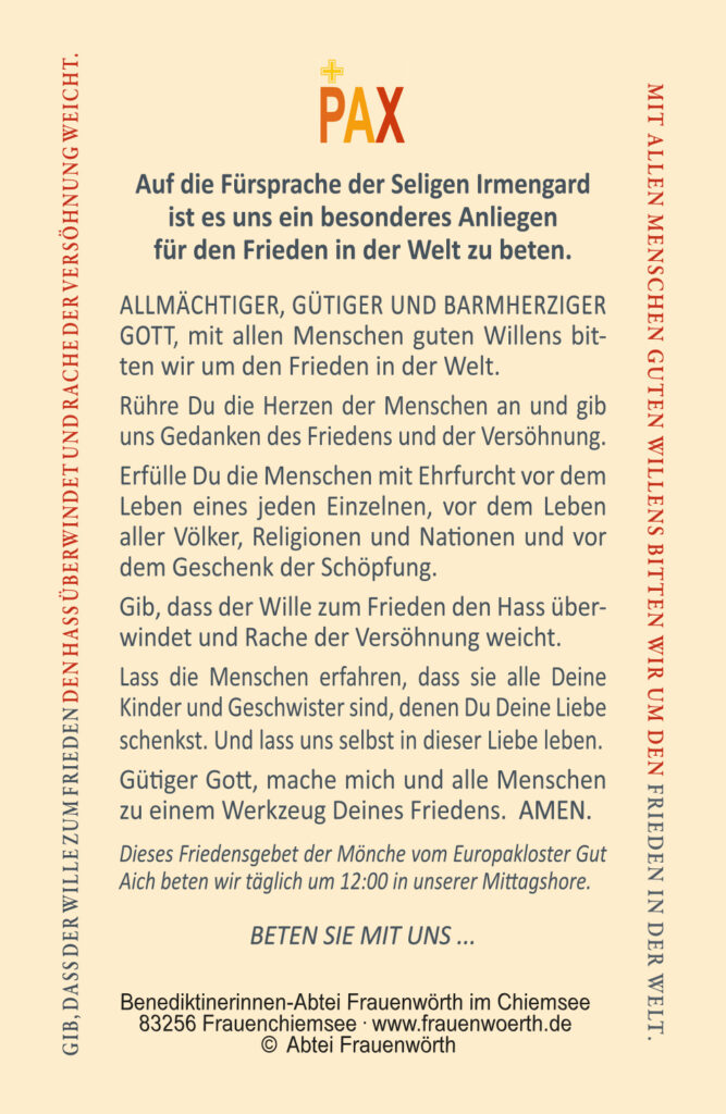 Ein besonderes Anliegen der Benediktinerinnen unter Leitung von Äbtissin Johanna Mayer OSB ist in diesem Jahr das gemeinsame Friedensgebet, das im Rahmen des Gottesdienstes mit allen Besuchern gesprochen wird. Das Gebet, das täglich in der Mittagshore des Klosters gebetet wird, bittet um Versöhnung, Ehrfurcht vor dem Leben und ein friedliches Miteinander unter den Völkern.
