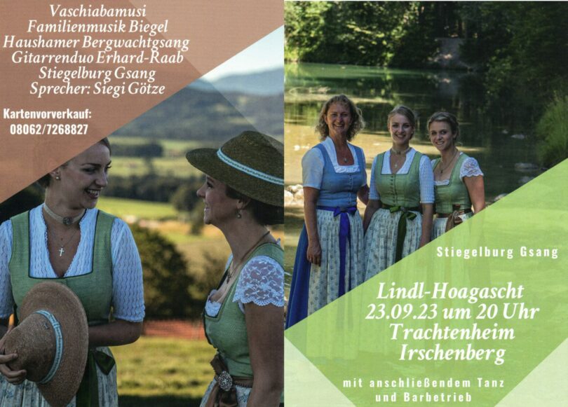 Am Samstag, 23. September 2023, findet der jährliche Lindl-Hoagascht im Trachtenheim Irschenberg statt. Die Veranstaltung lädt Musikliebhaber zu einem Abend mit traditioneller bayerischer Musik ein.