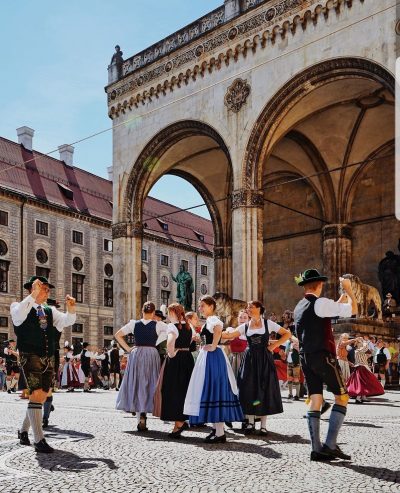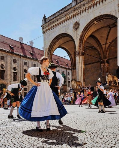 Der 01. Juni 2019 war ein besonderes Datum für die Trachtler des Isargaues. Nach genau 147 Planungstagen, zwei großen Gesamtproben und zahlreichen Proben innerhalb der Vereine war es endlich soweit: Der 1. Isargau Trachten-Flashmob ( = größere Menschenansammlung) wurde in München aufgeführt. Treffpunkt war der Innenhof des Rathauses am Marienplatz. Die Vorfreude war groß, und selbst einige der erfahrenen Tänzer waren nervös. Kein Wunder, denn einen Auftritt wie diesen gab es noch nie in der Geschichte des Isargaues. Nach letzten Absprachen und Vorbereitungen ging es dann in kleinen Gruppen zum Odeonsplatz. Bereits der erste Flashmob war ein voller Erfolg und gut besucht. Anschließend gab es noch zwei weitere am Marienplatz, die den ersten bei weitem an Zuschauern und Begeisterung übertrafen. Die Tänzer waren abwechselnd in Platter- und Volkstanzkreise aufgeteilt. In der Mitte standen die Musiker, die den Auftritt mit Ziach und Tuba tatkräftig begleitet haben.