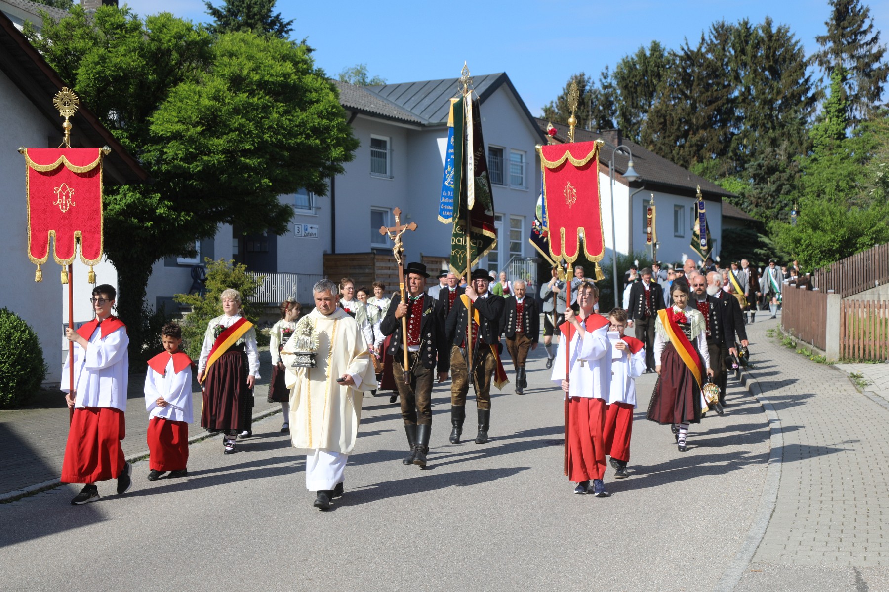 Die Ministranten zusammen mit dem Diakon Christian Pastötter empfingen am Ortsrand die pilgernde Trachtlerschar