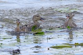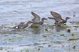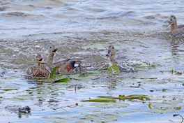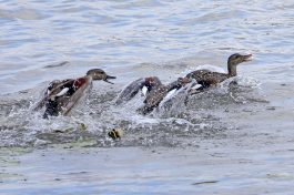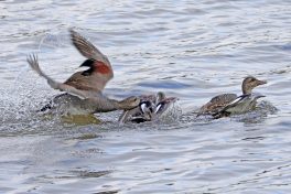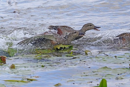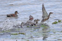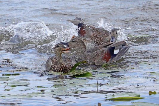 Eine Gruppe Schnatterenten fliegt ein. Kaum gelandet fängt ein Gerangel zwischen den Erpeln an.