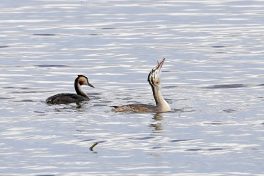 Die jungen Haubentaucher sind sicher schon in der Lage, selbst Fische zu erjagen. Aber es ist einfacher, ständig zu klagen. Dann werden die Fische vom Altvogel gejagt und übergeben. Jetzt muss der Fisch nur noch runtergewürgt werden.