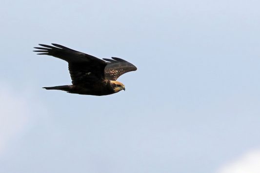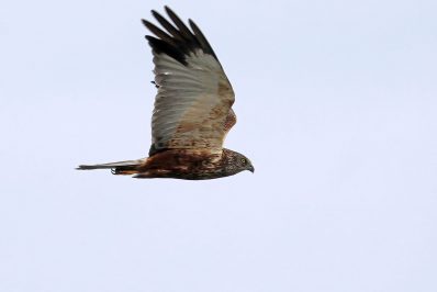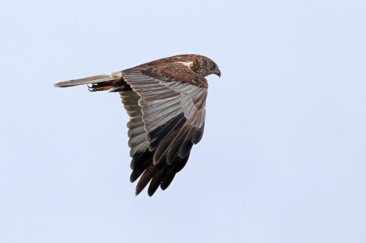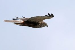 Ein Rohrweihen Weibchen fliegt nahe am Turm vorbei.