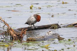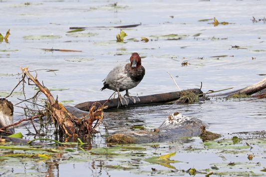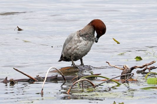 Das angeschwemmte Holz mag viele Besucher stören. Die Tafelenten sind darüber nicht unglücklich. Zum Ruhen und Gefiederputz eine gute Stehmöglichkeit.