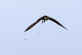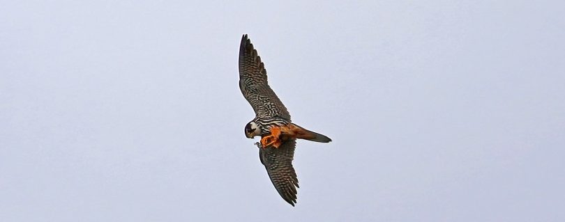 Und wieder nähert sich ein Baumfalke. Er hat vermutlich eine Libelle gefangen und frißt sie im Flug. Danach lässt er die Flügel fallen und die Jagd geht weiter. Auch andere körperliche Bedürfnisse werden im Flug erledigt.