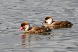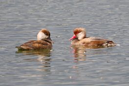 Einige Tafelenten Männchen machen Gefiederputz vor dem Turm. Das Prachtkleid ist schon ansatzweise zu sehen.