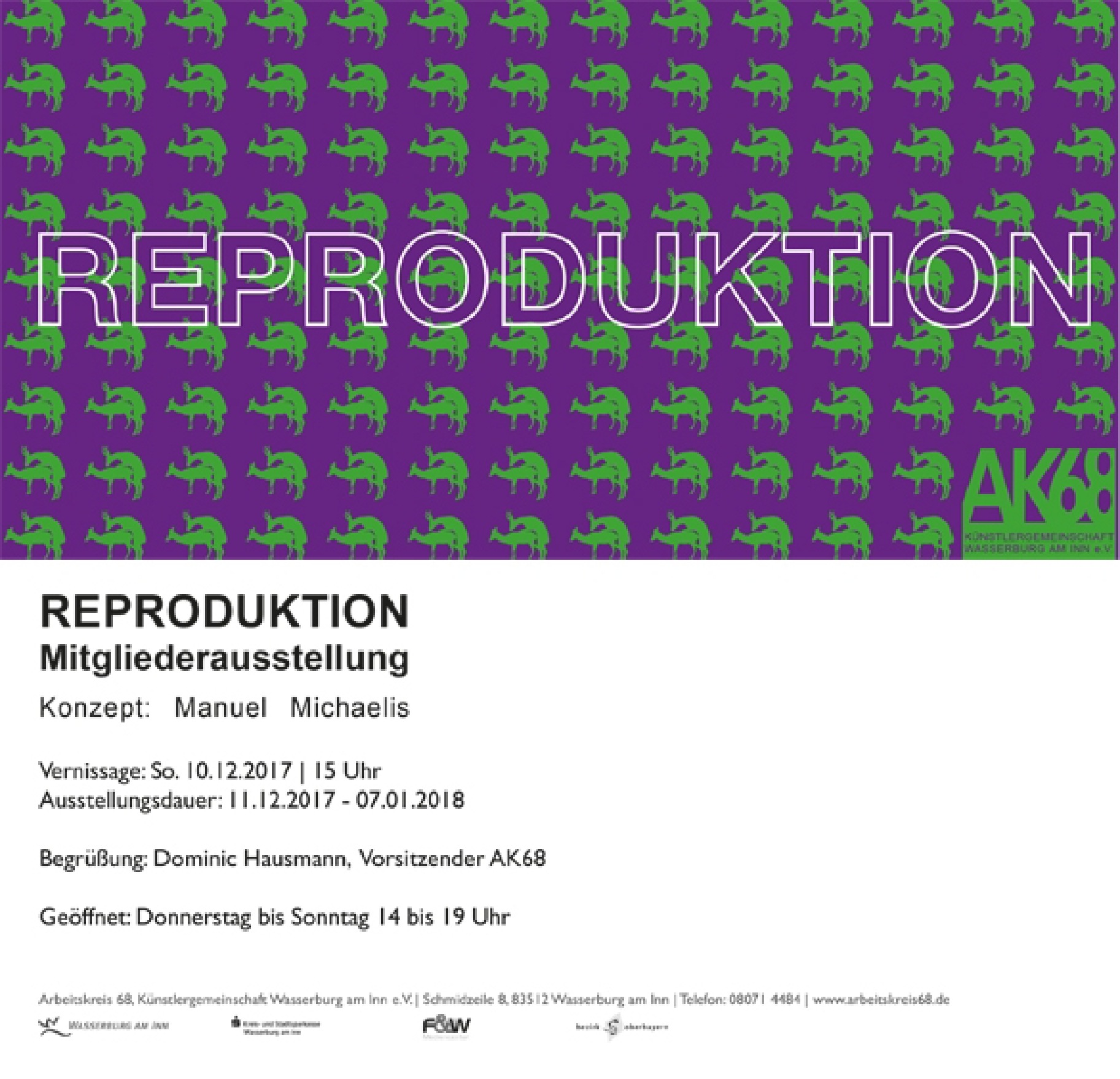 Der Kulturförderverein Prien a. Chiemsee empfiehlt seinen Mitgliedern die Ausstellung REPRODUKTION  im Ganserhaus, Schmidzeile 8 in Wasserburg am Inn. Die Vernissage hierzu ist am Sonntag, 10. Dezember um 15 Uhr, die Ausstellung dauert dann bis 7. Januar (donnerstags bis sonntags von 14 Uhr bis 19 Uhr).