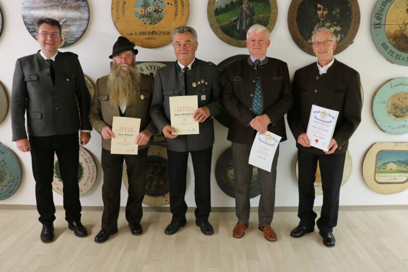Schützenkommisar Heinz Scheck beendet nach zehn Jahren seine Tätigkeit als oberste Schiedsinstanz in der Königlich privilegierten Feuerschützengesellschaft Aschau von 1607 (FSG Aschau) „Es gab nicht allzu viele vereinsinterne Streitfälle in den vergangenen zehn Jahren, die einer Entscheidung durch den Schützenkommisar bedurften“, zog Heinz Scheck bei der Jahreshauptversammlung in der Schiessstätte eine positive Bilanz seiner Tätigkeit. „Ich habe dieses Amt von Altbürgermeister Kaspar Öttl vor zehn Jahren übernommen und gebe es nun weiter an den zweiten Bürgermeister Michael Andrelang“. Einstimmig beschloss die Versammlung Heinz Scheck zu entlasten und das Amt des Schützenkommisars an Michael Andrelang zu übergeben. Schützenmeister Franz Kiesmüller überreichte dem scheidenden Schützenkommisar eine Urkunde als Dank und Anerkennung für seine Tätigkeit. Das Abzeichen des deutschen und des bayerischen Sportschützenbundes für 50-jährige aktive Mitgliedschaft verlieh Schützenmeister Franz Kiesmüller an Alois Schmid und Josef Ladstätter, das Abzeichen für 40 Jahre erhielt Peter Staudacher. Hedwig Scheck und Wolfgang Kink wurden für 50-jährige Vereinsmitgliedschaft geehrt und Kaspar Öttl für 40 Jahre.