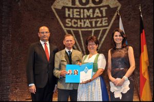 Aufnahme des Bärenschädels aus der Laubensteinhöhle in die Walhalla der 100 Heimatschätze bei einem Festakt in München mit dem bayerischen Finanz- und Heimatminister Albert Füracker (links) dem Vorsitzenden des Frasdorfer Heimat- und Kulturvereins Rupert Wörndl, der Schriftführerin des Vereins Martina Stoib und der damaligen Kultusministerin Professor Dr. Marion Kiechle