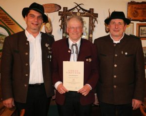 Der Schützenmeister der SG Sachrang Martin Bichl (rechts) und Gauschützenmeister Bernhard Brehmer (links) überreichen das Ehrenzeichen für 40 Jahre aktive Mitgliedschaft im Bayerischen Sportschützenbund (BSSB) und im Deutschen Schützenbund (DSB) an Konrad Baumgartner.