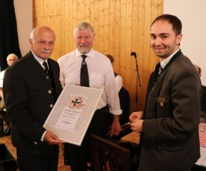 Der Vorsitzende des Veteranen- und Kriegervereins Wildenwart Florian Bauer (Mitte) überreichte dem ehemaligen Vorsitzenden Heinrich Rehberg (links) die Urkunde für die Ehrenmitgliedschaft des Wildenwarter Traditionsvereins; rechts Schriftführer Michael Schweiger