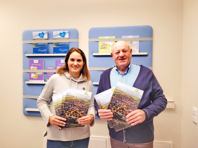 Bericht und Foto: Gemeinde Eggstätt – Pia Steen von der Tourist-Information Eggstätt und Bürgermeister Christian Glas präsentieren den neuen Jahreskalender 2023