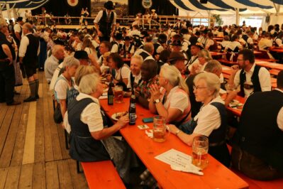 Barbara Heinrich aus dem KAB-Team sprach abschließende Worte zum christlichen Engagement in der Arbeitswelt und überreichte Diakon Wagner ein Geschenk. Das anschließende gemeinsame Essen wurde in Verbundenheit mit dem Trachtenverein “Immergrün” Altenbeuern ins Festzelt verlegt. Dort konnte man gut bewirtet das Gespräch suchen und den Darbietungen des Gaudirndldrahn im Rahmen des Gaufestes folgen. Unter den Gästen der KAB war auch Urlaubsvertretungspfarrer Dr. Darius Magunda aus Uganda, der seit Jahren die Belange der KAB begleitet.