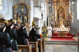 Mit einem zünftigen Marsch setzte sich die Musikkapelle Schleching unter Leitung ihres Kapellmeisters Walter Reisenauer in Bewegung, vom Vorplatz des Gasthauses Post ging es in die Pfarrkirche. Es folgten die Mitglieder des Trachtenvereins; denn es wurde nicht nur der Kirchweih-Gottesdienst gefeiert, auch der Jahrtag des Trachtenvereins d’Gamsgebirgler.