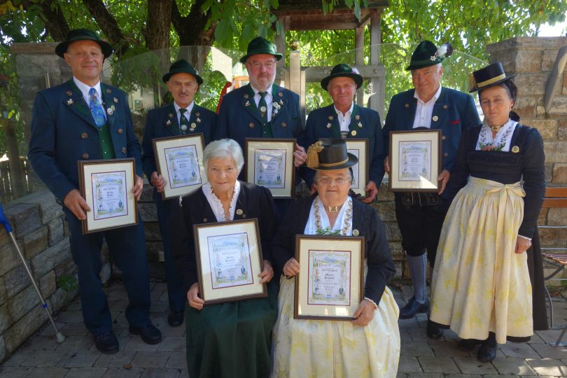 Der Jahrtag des Rottauer Trachtenvereins konnte ohne große Einschränkungen, fast so wie sonst immer, abgehalten werden. Er begann, wie es Brauch ist, mit drei Kanonenschlägen vor dem morgendlichen Gebetläuten. Unter Einhaltung aller Coronaauflagen fand der Gottesdienst in der St.-Michaelskirche statt, den Pfarrer Simon Mösenlechner zelebrierte. Sehr zur Freude der vielen Besucher spielte die Dorfmusi die Haydn-Messe und alle sangen mit. Nach dem Erntesegen zog ein stattlicher Zug zum Friedhof. Dort hielt Oberministrant Anderl Stuiber das Totengedenken für alle verstorbenen und vermissten Vereinsmitglieder am schön geschmückten Kriegerdenkmal ab. Dabei gab es wieder drei Kanonenschläge. Nach einer zweijährigen Zwangspause durfte dann wieder zu den Klängen der Dorfmusi zum Vereinslokal Gasthaus Messerschmied marschiert werden. Einige waren davon so angetan, dass sie sagten, man hätte durch das ganze Dorf marschieren sollen, so schön war es. Der Saal war gut gefüllt, als Vorständin Lisi Hilger die vielen Mitglieder begrüßte, darunter Ehrenvorstand Felix Uth. Einen Gruß schickte sie an den zweiten Ehrenvorstand Hans Schmid senior. Einen besonderen Dank sprach sie Pfarrer Simon Mösenlechner für den feierlichen Gottesdienst und Anderl Stuiber für das Totengedenken aus und dem Kanonier Ernst Henken. Die kurze Versammlung stand ganz im Zeichen von Ehrungen. Hilger sprach über die zwei Veranstaltungen am Kirchplatz in den letzten Monaten zuerst „Wia´s bei uns der Brauch is“ und dann „Mostfest zum Mitnehmen“. Beide kamen bei den Besuchern sehr gut an und man sah ganz deutlich, wie froh die Leute sind, dass endlich wieder was los ist. Auch bei der Hochzeit unseres stellvertretenden Vorstands Miche Summerer junior und seiner Frau Magdalena, die 2. Jugendleiterin ist, durfte der Verein dabei sein. Am Kirchplatz führten die Jungen Gederer einen Tanz auf und am Abend zeigten die Aktiven den Sterntanz. Im Ausblick verwies die Vorständin auf den geplanten Trachtenkleidermarkt am 8. und 9. Oktober und den Rauhnacht-Hoagascht am 28. Dezember. Zwischendurch spielte die Rottauer Dorfmusi fleißig auf. Danach nahmen Hilger und ihre beiden Stellvertreter Miche Schmid und Miche Summerer die offizielle Verabschiedung der bei den Neuwahlen nicht mehr angetretenen Mitglieder Anderl Schmid, Kathi Stettner und Martin Färbinger vor. Schmid war 34 Jahre im Ausschuss, davon 19 Jahre als stellvertretender Vorstand, Stettner war 10 Jahre Beisitzerin und Färbinger 7 Jahre Beisitzer. Anderl Stuiber bekam auch ein Geschenk für seine langjährige Mitarbeit im Verein. Eine Ehrennadel für 25-jährige Mitgliedschaft erhielten Christl Huber, Hans Müller und Christian Buchner. Der Gauvorstand des Chiemgau-Alpenverbandes Miche Huber begrüßte die Rottauer mit den Worten „Schee is, dass ma wieda zsammkemman und d`Musi dabei is!“ Bevor er die Gaunadel für 40-jährige Mitgliedschaft an Irmgard Färbinger, Martina Hain und Leni Stephan übergab, forderte er sie auf: „Lassts net aus!“ Wolfgang Ballauf wird die Gaunadel nachgereicht. Hilger erklärte, welche Voraussetzungen man bei den Gederern erfüllen muss, um Ehrenmitglied werden zu können. Die drei Vorstände überreichten den sieben neuen Ehrenmitgliedern jeweils Ehrenurkunde und Abzeichen unter dem Beifall der Mitglieder. Es sind Maria Schmid, Hilde Holzner, Miche Sichler, Stefan Sichler, Miche Stephan, Max Winklmair und Gauvorstand Miche Huber.