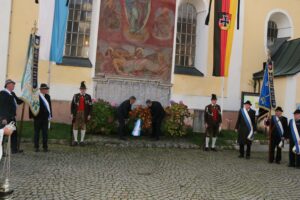 Vorstand Erich Rasinger gedenkt am Ehrenmal, begleitet von den Fahnen des Patenvereins Rohrdorf