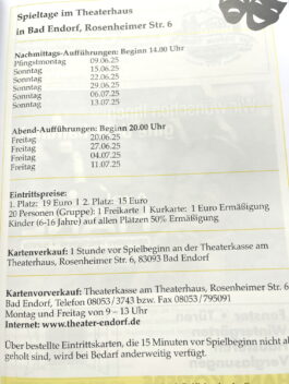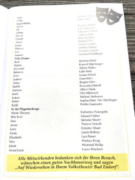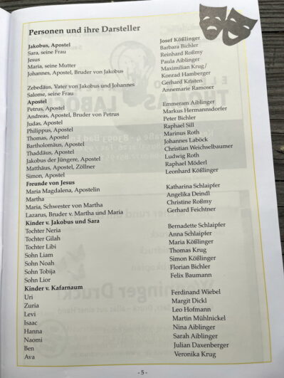 Während der Vorstellungen wechseln die Szenen von „Früher“ immer wieder ins „Heute“, die Autoren und Spielleiter Julia und Werner Hofmann nehmen auf diese Weise die Zuschauer mit hinein ins Geschehen. Die Gespräche sind unterhaltsam und machen nachdenklich, unter anderem beim Dialog von Hauptdarsteller Josef Kößlinger (Apostel Jakobus) mit Jesus, dargestellt von Reinhard Roßmy. Etwas Besonderes sind auch die Kompositionen von Matthias Linke, dessen Ensemble für die einführende und begleitende Musik sorgt. Während der Pause gibt es noch Gelegenheit, etwas Gutes für den JAKOBUS Hospizverein e.V. für Stadt und Landkreis Rosenheim zu tun. Eintrittskarten für die beiden letzten Aufführungen am Freitag, 11. Juli und am Sonntag, 13. Juli gibt es im Vorverkauf an der Theaterkasse am Theaterhaus (täglich bis Freitag von 9 Uhr bis 13 Uhr – telefonisch unter 08053-3743 oder im Internet auf www.theater-endorf.de. Weitere Karten sind eine Stunde vor Spielbeginn beim Theaterhaus erhältlich.