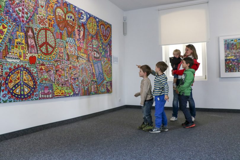 Noch bis Sonntag 28. Mai 2017 wird eine Retrospektive des weltberühmten Pop Art Künstlers James Rizzi gezeigt. „Pop Art“ bedeutet so viel wie „populäre Kunst“ und erfreut sich in der heutigen Zeit noch an großer Beliebtheit. Mit klar definierten Linien, lebhaften Farben sind häufig plakative Motive aus dem täglichen Leben dargestellt. James Rizzis Kunst ist geprägt von der pulsierenden Welt seiner Heimatstadt: heitere Menschen, bunte Vögel, lachende Wolkenkratzer, Katzen, Ufos und das New Yorker Yellow Cab finden sich immer wieder in seinen Werken. Gerade durch diese humorvolle Sprechweise seiner Bilder wirken Rizzis Kunstwerke gerade auf die jüngere Generation besonders anziehend. Kinder sind die geborenen Kunstliebhaber – sie malen, bevor sie schreiben lernen und können erlernte Begriffe zeichnerisch umsetzen. Die Kunsthistorikerin Ingrid Fricke führt am Sonntag, 21. Mai um 11 Uhr Familien durch die Ausstellung in den Räumlichkeiten der Galerie im Alten Rathaus und stellt die farbenprächtigen und quirligen Gemälde kindgerecht vor. In den Werken des Künstlers herrscht eine ansteckende Fröhlichkeit, die die jungen Besucher zum Weiterdenken und Selbermalen anregt. Eine Anmeldung zu der Familienführung ist nicht erforderlich.