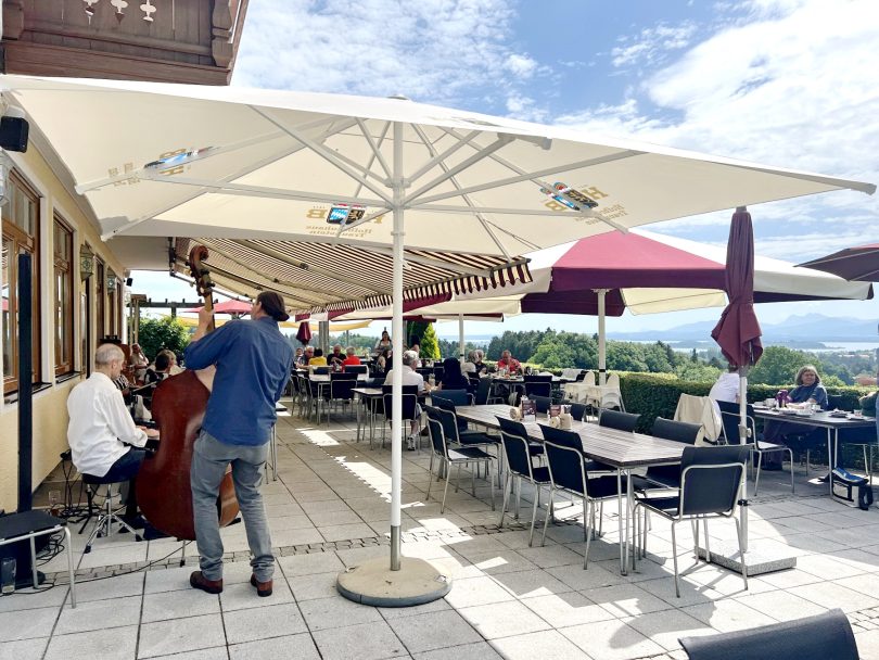 Zum ersten Mal seit dem Start des Jazz-Frühstücks vor fast drei Monaten konnte die Veranstaltung auf der sonnigen Terrasse des Gasthof Weingarten durchgeführt werden. Die zahlreichen Gäste haben dabei nicht nur das reichhaltige Frühstück und die Jazz-Klänge der Formation „Choose Jazz“ genossen, sondern sie konnten sich auch an dem unglaublichen Chiemsee- und Panorama-Bergblick sattsehen. Das Jazz-Frühstück findet alle 14 Tage am Samstagvormittag statt und zu hören gibt es wechselnde kleine Jazz-Formationen aus der Region. So waren dort z.B. schon die Labradorians aus Übersee und der Aschauer Gitarrist Philipp Stauber zusammen mit dem Saxophonisten Til Martin zu hören. Letzten Samstag gab es wieder ein Gastspiel des Priener Pianisten und Jazz-Sängers Johannes Freyberger, der diesmal den Kolbermoorer Bassisten Ernst Techel zur Unterstützung dabei hatte.