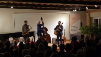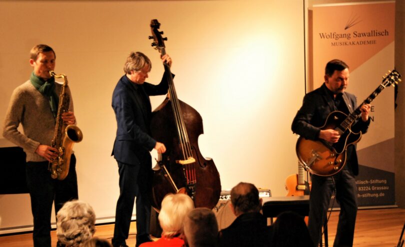 Für die Kenner hörbar spielte der in Aschau lebende Jazzmusiker auf seiner Archtop Gitarre – umgangssprachlich als Jazzgitarre bezeichnet – mit einer bogenförmig geschnitzten Decke wie bei einer Geige, also entsprechend stilgerecht für eine Musikakademie. Als Schüler der Gitarrenlegenden Joe Pass und Howard Roberts u.ä. ist er in internationalen Jazzkreisen für seinen ganz eigenen Stil bekannt. Philipp Stauber startete mit dem irischen Song „Danny Boy“. Ursprünglich eine Ballade, aber eher bekannt durch Jonny Cash, wurde in diesem Fall einzigartig vorgetragen. Mit von der Partie war einer der bekanntesten Jazz-Bassisten sowie Echo Preisträger Henning Sieverts (u.a. Jazztime Moderator beim BR), der mit Philipp Stauber auf eine jahrzehntelange gemeinsame Spielzeit zurückblicken kann und von dem erzählt wird, er könne Gedanken lesen, indem er ahnt, was sein Gitarrenpartner spielen wird bevor dieser es selbst weiß. Und Till Martin am Tenor-Saxophon mit einem geradlinigen, schnörkellosen Jazz, wenn er spielt, als würde er Geschichten erzählen.