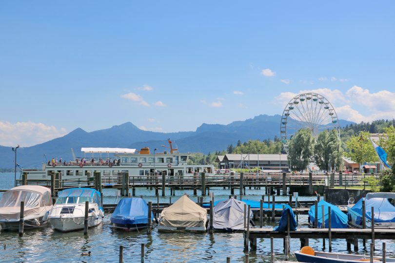 Foto: Prien Marketing GmbH – Blick auf den Hafen in Prien-Stock, derzeit mit einem Riesenrad