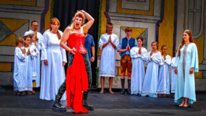 Der Teufel tobt – und genießt es: In grellem Rot, mit geballter Energie und wilder Geste erhebt sich das Böse zum großen Auftritt. Die Gegenkräfte bleiben ruhig – noch.