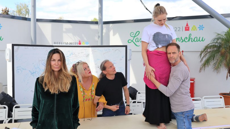Alexandra Kamp (Glaube), Tine Wittler (Base), Frank Zimmermann (Dünner Vetter), Jenny Löffler (Buhlschaft) und Julian Weigend (Jedermann) haben bisher gemeinsam mit den anderen Cast-Mitgliedern vor allem in Berlin geprobt. Gestern Abend waren sie zum ersten Mal auf dem Festspielgelände, und sind begeistert vom Areal!