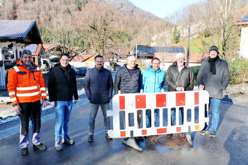 Der Fels im Untergrund und die Teerrückstände im Aushub der bisherigen Straße erschwerten das Vorankommen ebenso, wie die Enge der Baustelle. Die großen Maschinen konnten kaum zum Einsatz gebracht werden und trotz der Einschränkungen lief auch immer noch der Individualverkehr durch die Baustelle. Bürgermeister Simon Frank bedankte sich bei den Anwohnern ganz herzlich für ihre Geduld und für ihre gute Zusammenarbeit mit den Arbeitern. Auch die Versorgung der Arbeiter mit Heißgetränken bei nasskalter Witterung erfolgte durch die Frauen längs der Straße ohne viel Aufhebens. Die bisherige Straße wurde im Zuge der Arbeiten vollständig herausgerissen, der Bauschutt in der Nähe zwischengelagert und je nach Belastung entsorgt oder wieder in den Untergrund eingebaut; ein ordnungsgemäßer Unterbau und eine vorschriftsmäßige zeitgemäße Entwässerung bilden eine solide Grundlage für die aktuelle Straßenführung. Auf gut 250 Meter Länge erschließt die neu gebaute Straße jetzt den Weiler Bach. Damit die neue Straße nicht gleich wieder für irgendwelche neue oder alte marode Versorgungsleitungen der Anlieger aufgerissen werden muss, wurde gleich Vorsorge bei Wasser, Abwasser, Strom, Beleuchtung und Glasfaserversorgung getroffen. Bei der Baumaßnahme wurden rund 350 Meter Regenwasserkanal erneuert. Die bisherige Trinkwasserhauptleitung wurde auf 200 Meter ausgetauscht und die bisherigen Rohre durch moderne Rohre ersetzt. Zusätzlich verlegte die Firma 420 Meter Speedpipe-Leerrohre als Grundlage für die spätere Glasfaserversorgung. Die Stromversorgung von Bach wurde durch die Erneuerung des gesamten Kabelsystems verbessert, für die Beleuchtung der Straße wurden neue Straßenbeleuchtungsmasten gesetzt. Die Beleuchtung wurde als eine der ersten im Aschauer Straßennetz bereits auf LED umgerüstet.