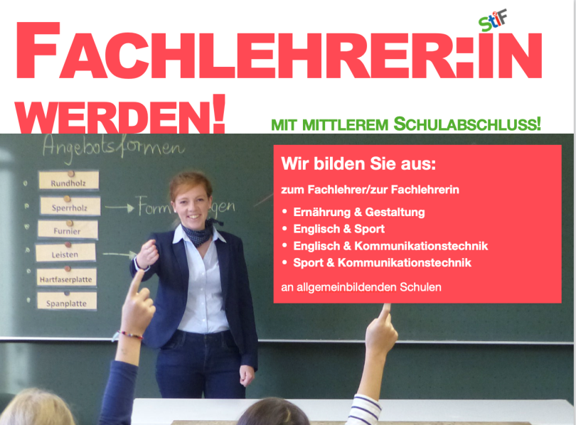 Das Besondere an der zweijährigen Ausbildung ist, dass die Bewerberinnen und Bewerber keinen Hochschulabschluss vorweisen müssen, sondern sich mit einem mittleren Bildungsabschluss und einer passenden beruflichen Vorbildung bewerben können. Nach Bestehen eines Eignungstests im März beginnt die Ausbildung im September 2022. Die Ausbildung als Lehrkraft für Ernährung & Gestaltung kann im Anschluss in einem Ausbildungsjahr mit dem Fach Sport erweitert werden. Weiterführende Informationen zur Bewerbung und den Ausbildungsgängen sind zu finden unter https://stif2.de/lehraemter/